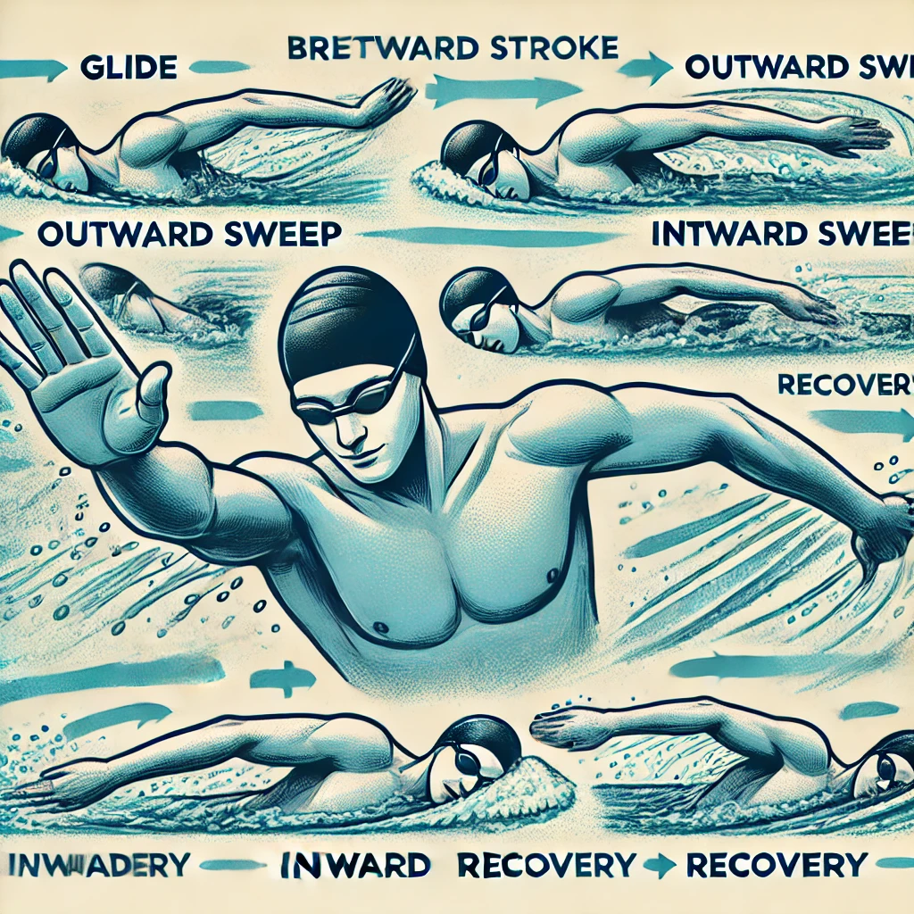 평영 스트로크는 팔을 사용하여 물을 밀어내며 추진력을 얻는 동작입니다. 팔 동작과 호흡, 타이밍이 조화를 이루어야 효율적인 수영이 가능합니다.